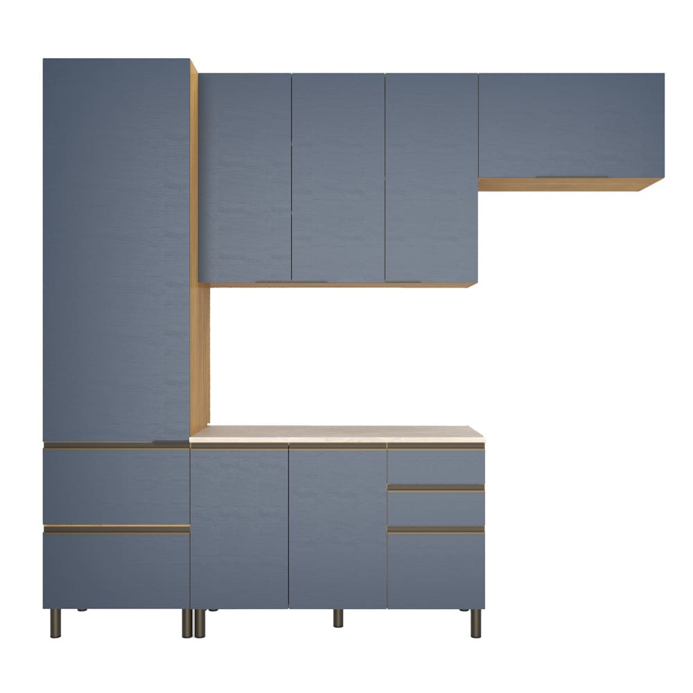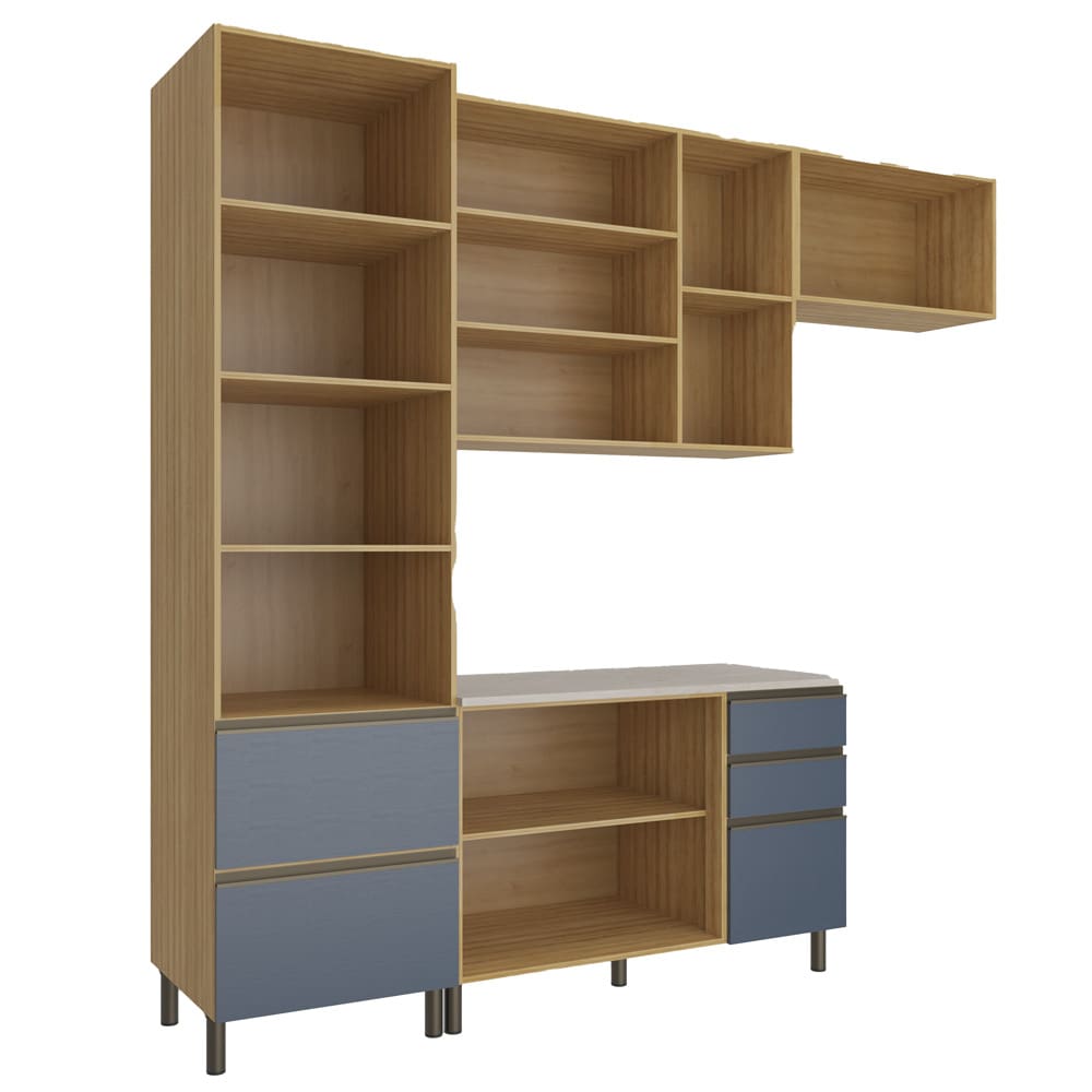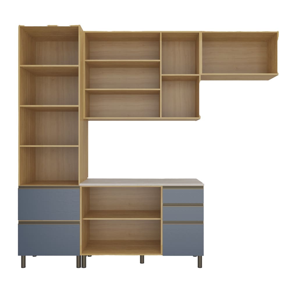 Cozinha Completa Bartira Cristal com 6 Portas, 5 Gavetas e 7 Prateleiras e 260cm de Largura - Lâmina de Mel/Azul Royal