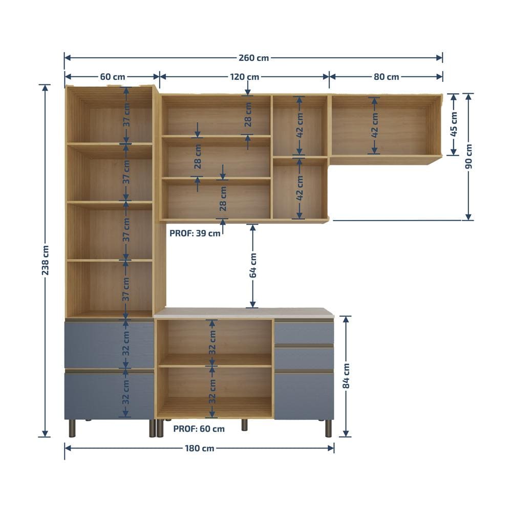 Conteúdo da Embalagem: -1 Cozinha Completa Bartira Cristal com 6 Portas, 5 Gavetas e 7 Prateleiras e 260cm de Largura - Lâmina de Mel/Azul Royal;