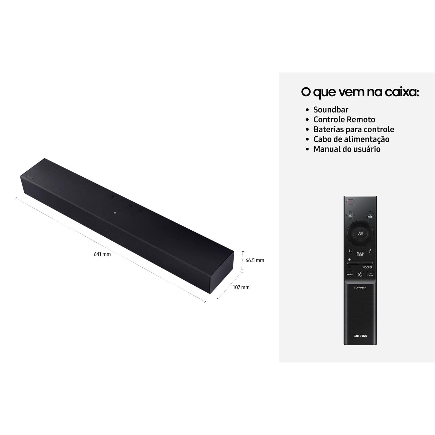 Conteúdo da embalagem: - 1 Smart TV 65" Samsung - 1 Controle Remoto - 1 Manual do usuário - 1 Cabo de força - 1 Soundbar Samsung HW-B400F/ZD - 1 Controle remoto - 1 Cabo de alimentação - 1 Manual do usuário do usuário e Garantia