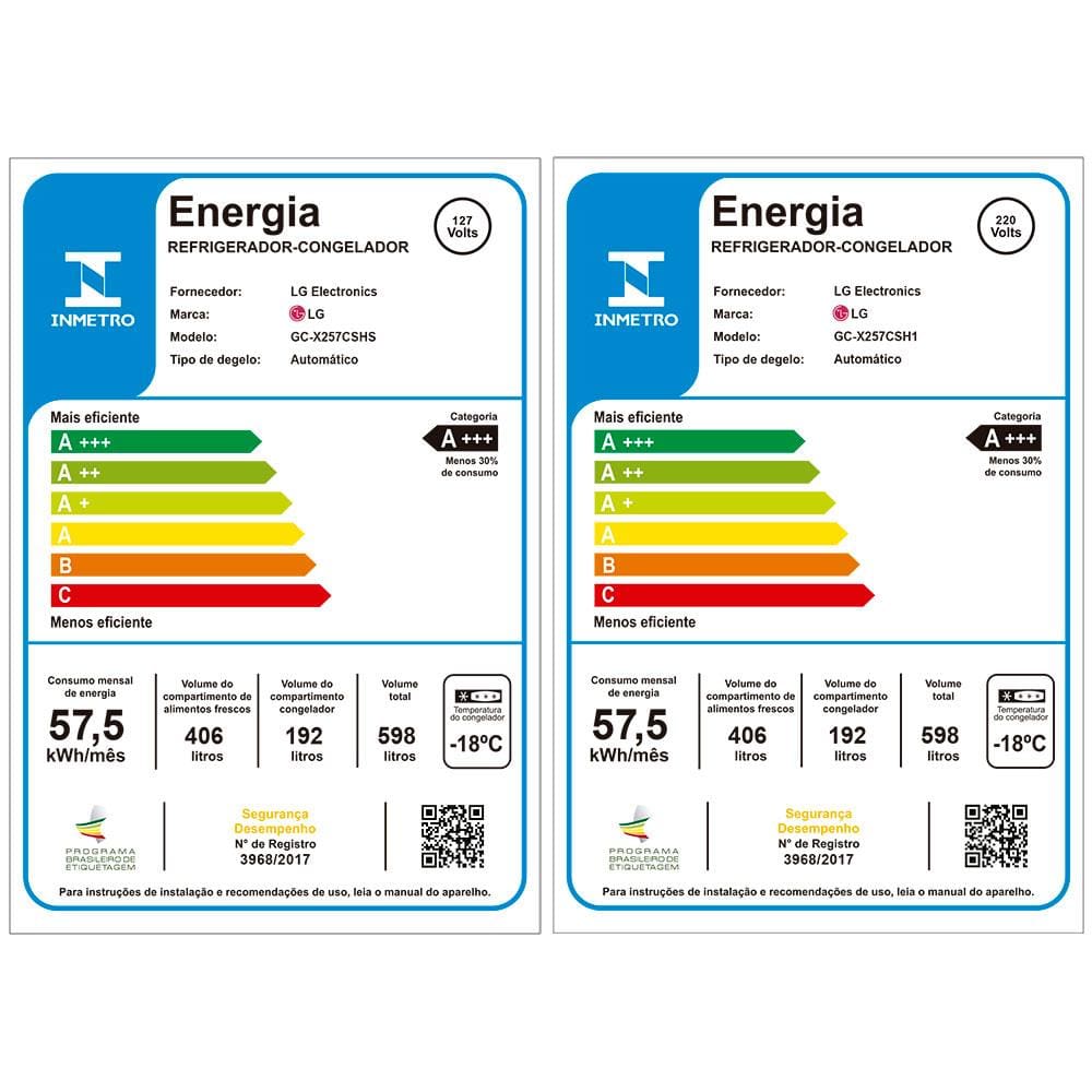 Conteúdo da embalagem: - 1 Geladeira LG Side by Side Inverter GC-X257CSH Frost Free com Tecnologias InstaView, UVnano, Thinq e Craft Ice Aço Escovado - 598 L