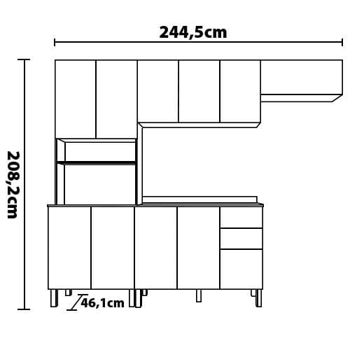 Estruturada em MDP e MDP de grande qualidade e durabilidade, ela é composta por um paneleiro amplo com lugar especial para manter o seu micro-ondas, armários aéreos equipados com prateleiras para melhor divisão, balcão com tampo e gavetas com corrediças metálicas. Muito funcional, ela possui bastante espaço para organizar melhor os seus mantimentos e louças, acabamento em finish foil, pés resistentes com regulagem de altura e ótima durabilidade.