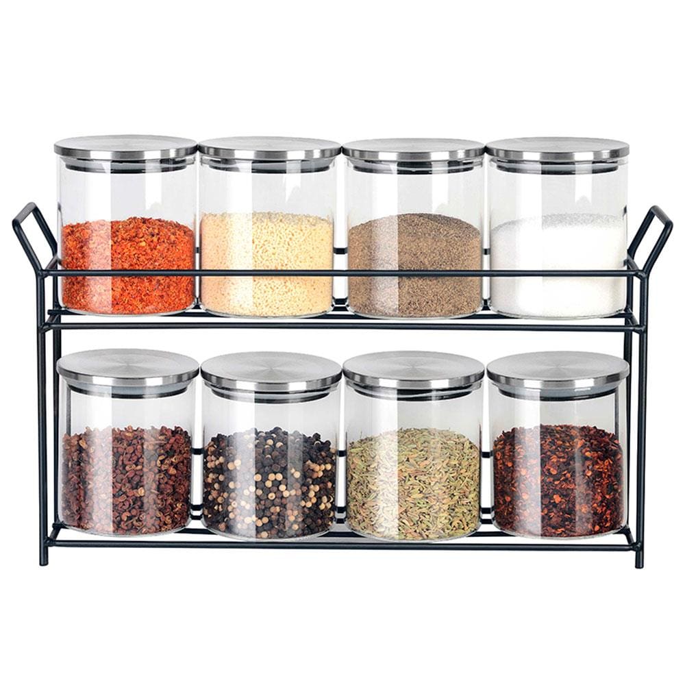 Contém 8 potes em vidro e com tampa de metal. Acompanha suporte que e facilita o uso do produto.