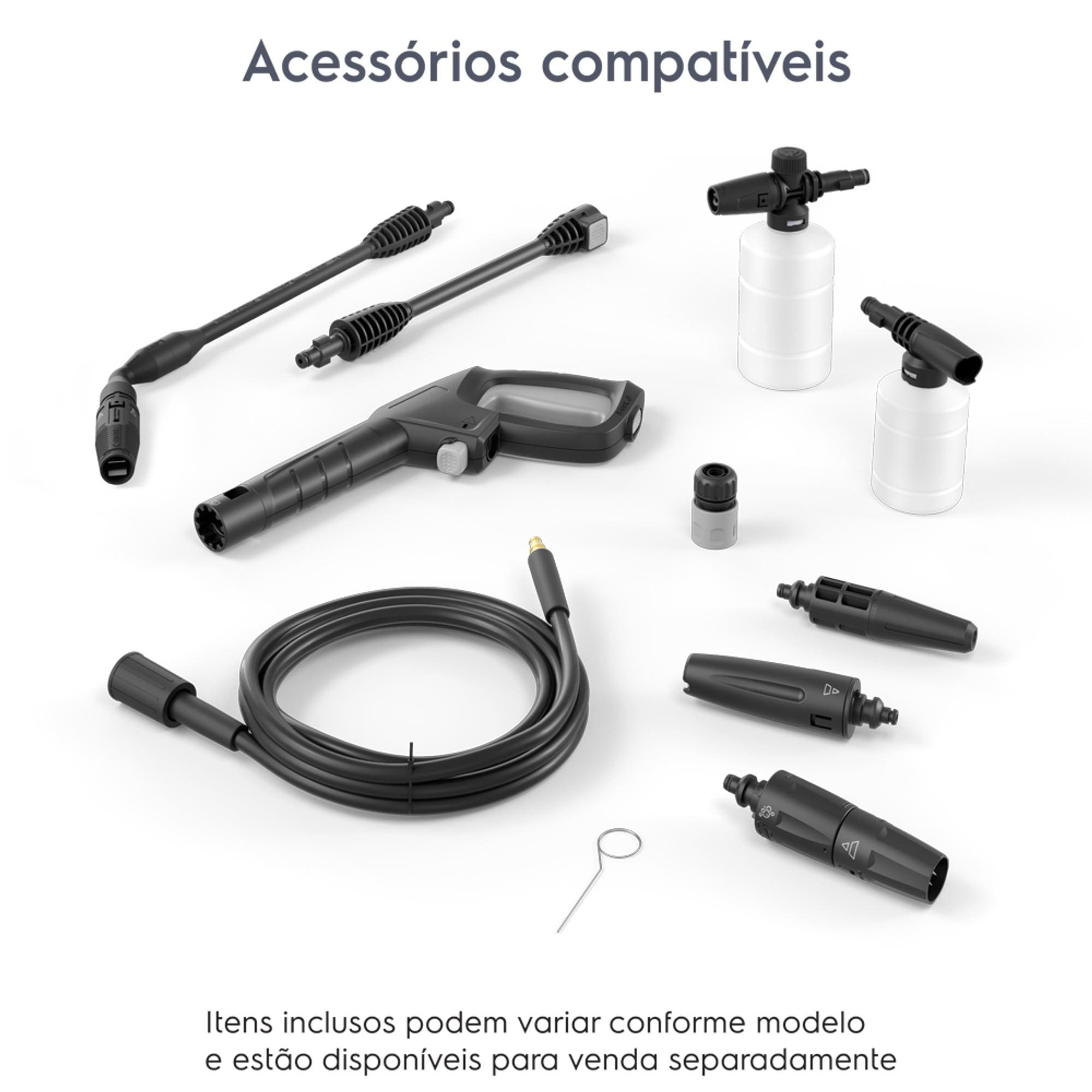 -Acessórios: Mangueira, Bico vario, Agulha de limpeza, Engate rápido e Aplicador de detergente.
