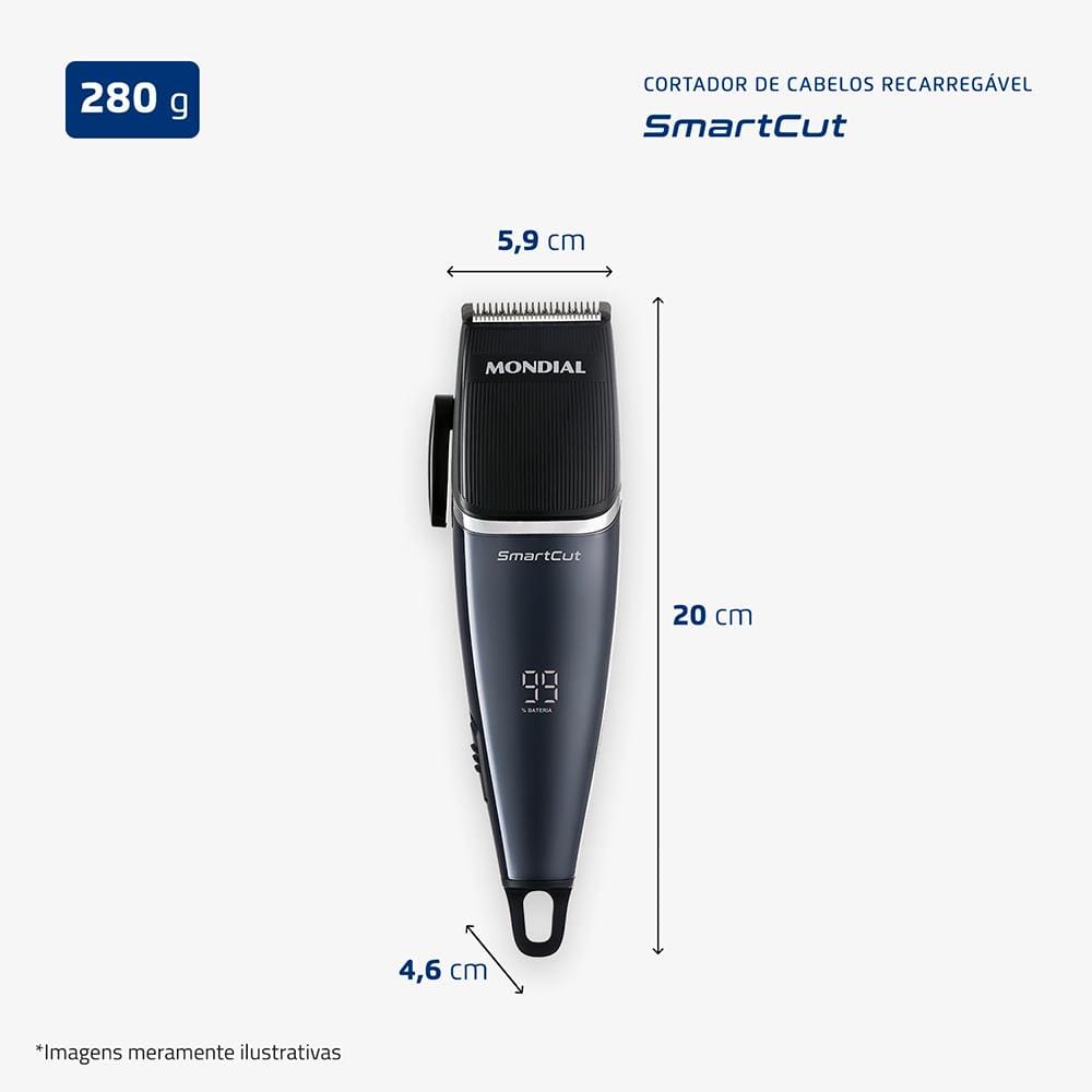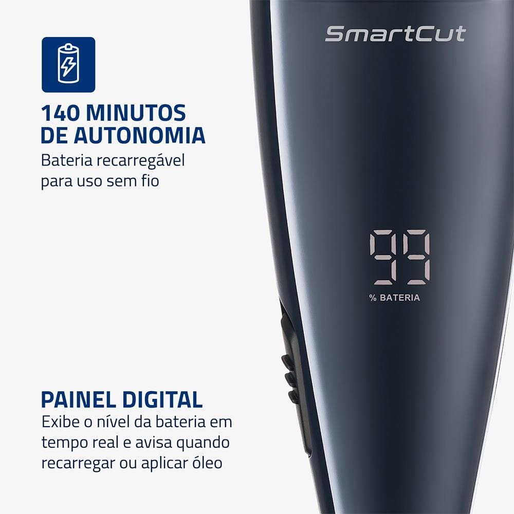 Seu painel digital facilita o uso ao exibir o tempo restante de bateria em tempo real e ainda sinaliza quando é necessário recarregar ou lubrificar as lâminas. Com até 140 minutos de autonomia, você pode realizar vários cortes sem depender de tomadas, ideal para uso em casa ou em viagens.