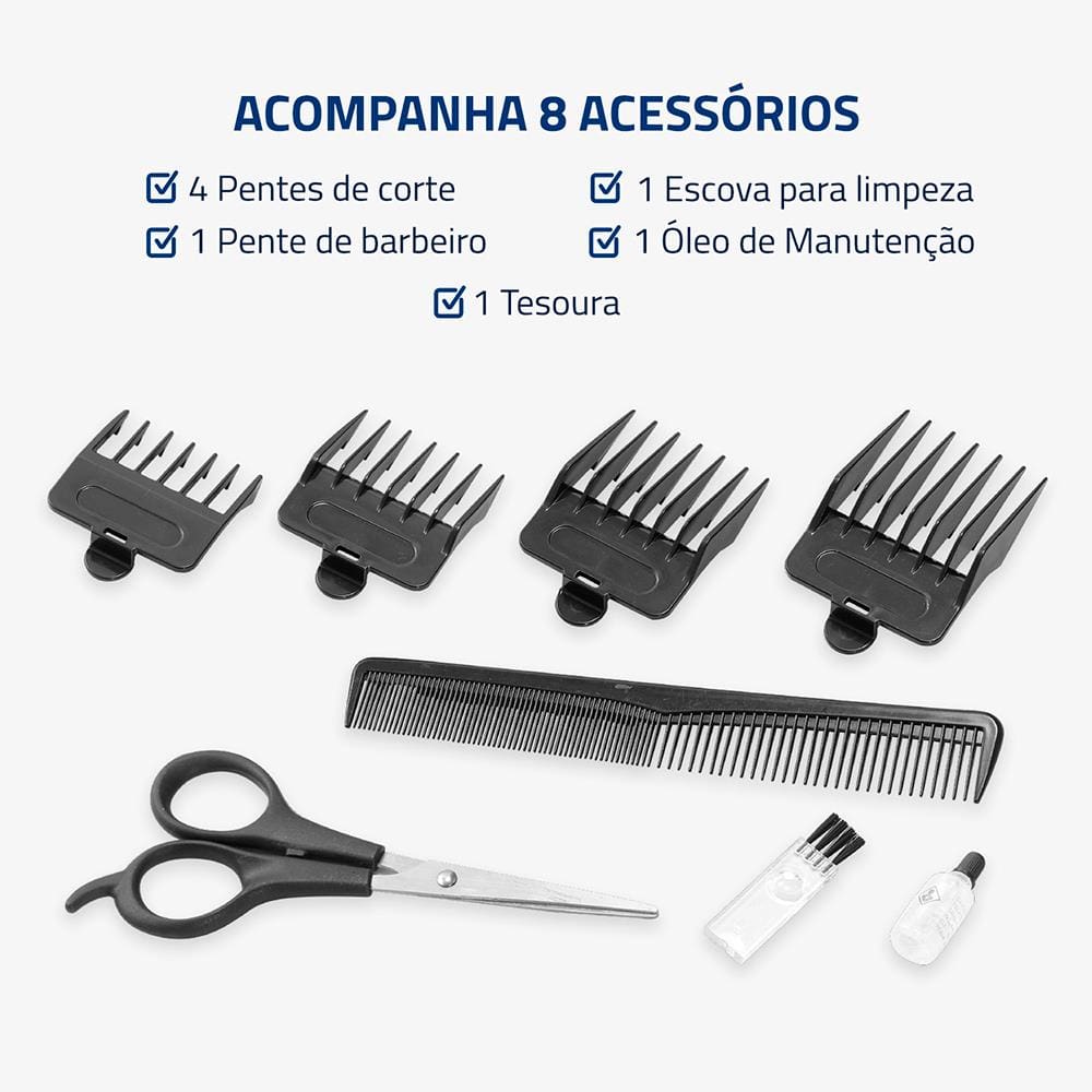 As lâminas em aço inox garantem cortes suaves, durabilidade e resistência, enquanto os acessórios inclusos como tesoura, pente barbeiro e óleo de manutenção proporcionam uma experiência completa de barbearia em casa.