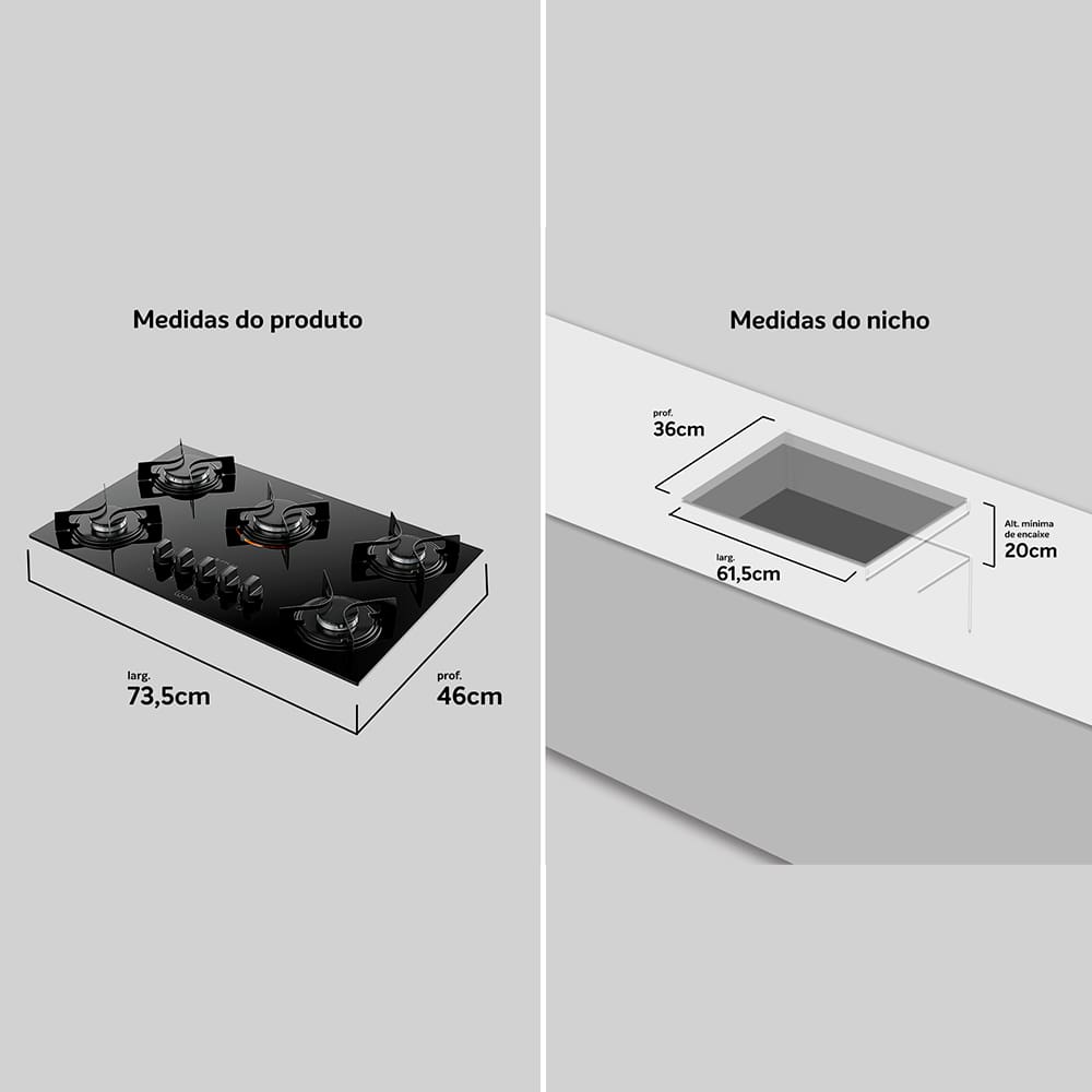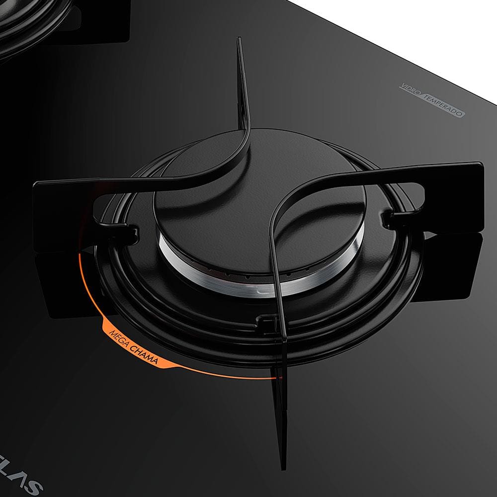 Conta com cinco queimadores – são três queimadores tradicionais e dois queimadores Mega Chama, para aqueles momentos em que um fogo mais alto é necessário. Seu acendimento é automático, no estilo girou, ligou – isso para facilitar seu uso enquanto você cozinha sua receita favorita.